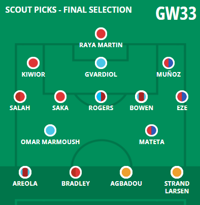 Omar Marmoush (£7.7m) joins Saka as a leading Double Gameweek 33 option, with Man City’s forward being the recommended armband recipient of both Captain Sensible and our Rate My Team (RMT) algorithm.