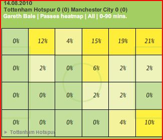 There is more of a defensive element to Bale’s role in this system; he made 15 tackles, had just 3 of his side’s 20 goal attempts -two inside the penalty box- and although he sees more of the ball in comparison to a 4-5-1, it’s interesting that 14% of all passes he made were played in his own defensive third of the pitch.