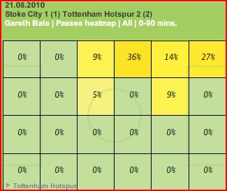 Bale saw less of the ball, but it calls the defensive side of his game into question less often, which given his natural offensive play, is perhaps a good thing. Just the 7 tackles were made, however he had an incredible 5 of his side’s 9 goal attempts -four inside the penalty box- and, as befitting of his more attacking role, none of his passes were played in the Spurs defensive third.