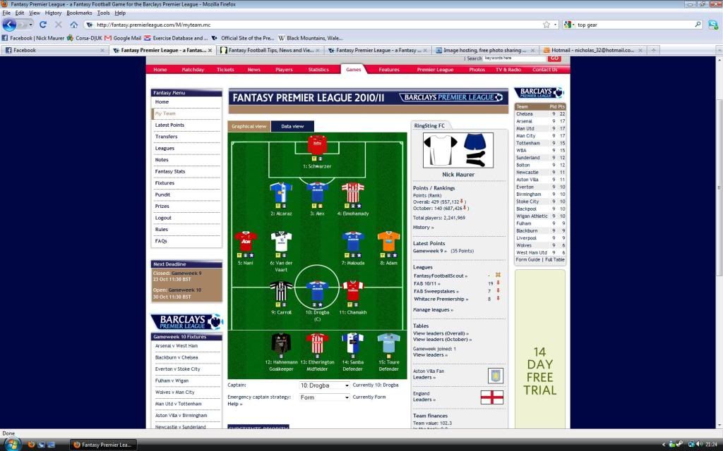 A lot of people are dropping Malouda but that looks a bit short sighted to me. When Lampard returns, it is going to be essential to have one of the two big Chelsea midfielders and so it seems silly to sell Malouda and lose 0.5M in value, only to want him back in a few weeks. The Tevez news is irritating, as he is another season keeper for me. It looks like I’ll be benching him and using Berbatov as my Fab-fodder, which means I’ll be stuck with one up front this weekend. Fingers crossed Captain Fabtastic pulls off another 22 pointer this weekend then.”