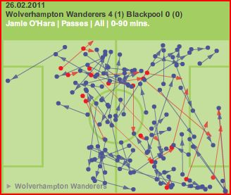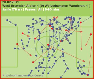 As this average position map from the Blackpool game shows, OβHara (24) is stationed in the heart of the Wolves midfield and, with his fair share of set-piece duties in addition, is quickly looking like the Midlands clubβs equivalent to Charlie Adam, with some talismanic performances that have undoubtedly helped boost the clubβs survival chances.