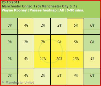 The most significant area for Rooney, though, the centre of the final third, shows a definite decrease in attacking potential over the two games. Against City, 22% (13% + 4% + 5%) of Rooney’s passes came in this vital area as he prompted and probed, looking for openings- against Everton, Rooney’s impact in this crucial part of the field halved, down to 11% (7% +4%). With Fergie reining in his star forward’s attacking sensibilities, their potency clearly diminished.