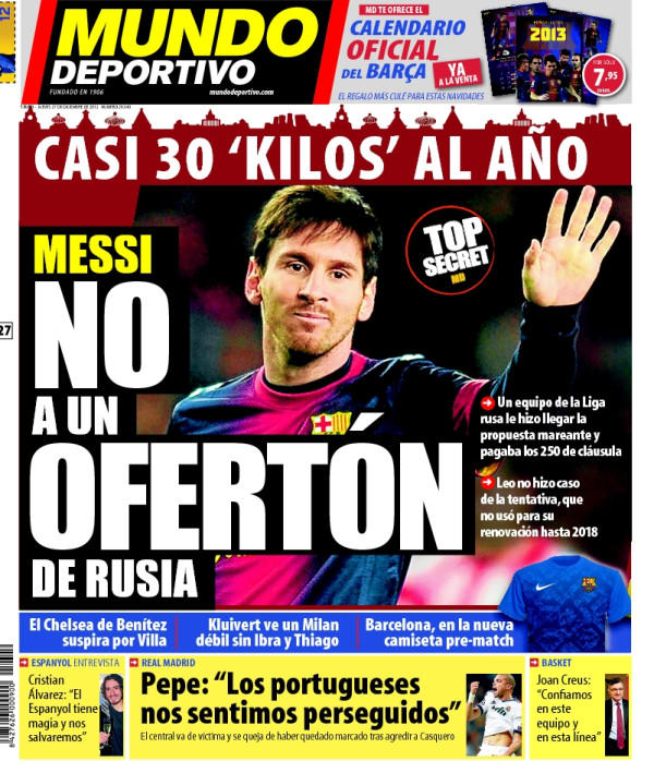 Barcelona have rejected a £250m bid from a Russian club for Lionel Messi. Messi was also offered £30m per year in wages. Lionel Messi's release clause is £250m, exactly what the Russian club reportedly offered however Barcelona have rejected the offer [Mundo].
