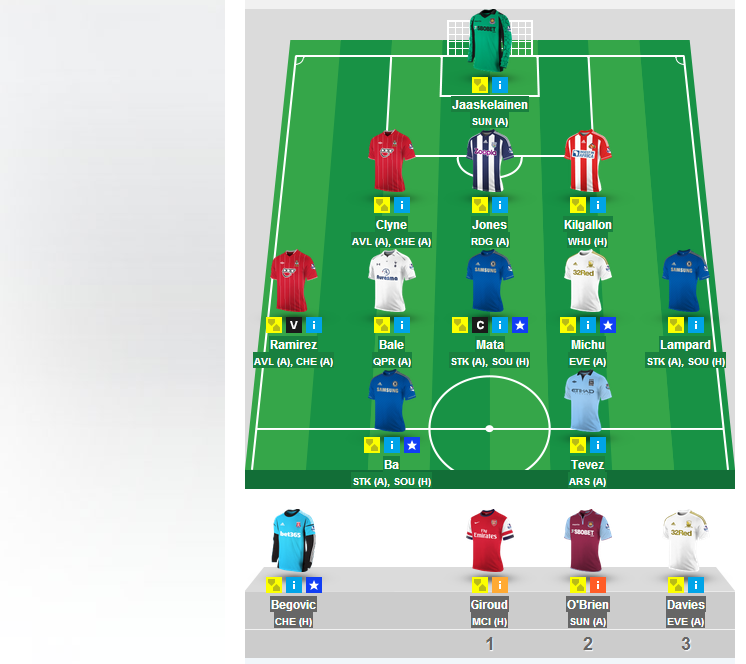 And I am benching Michu (definitely a risk, but given Evertons defensive record, I think the most likely miss is one goal, whereas the others are more likely to score and assist more£.