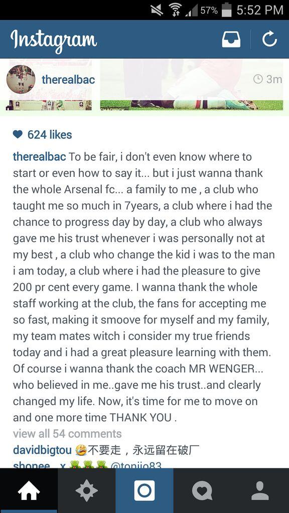"With Rosicky & Diaby coming back from injuries, we didnt has any room in our squad for Fabgregas. I wish him well at Chelsea."