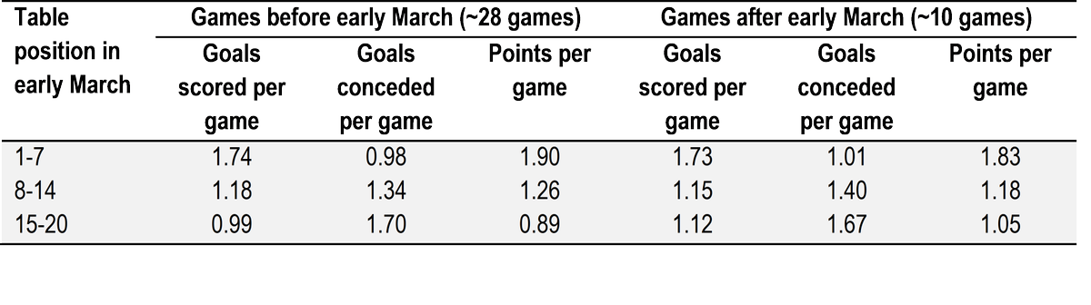The average number of goals scored per game by relegation battlers increases from 0.99 before early March by 13 per cent to 1.12 over the run-in. This may not sound like much, but, again, a statistical test finds that it’s not a fluke of the data sample. In only one of the past ten seasons has the goal output for relegation battlers decreased after early March. The brunt of this additional goal output seems to be borne mostly by Mid-table teams whose rate of goals conceded increases from 1.34 to 1.40 per game after early March.
