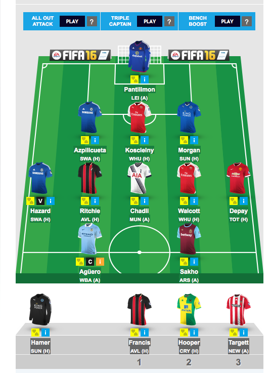Thanks. I went with a goal scoring midfield approach. Was thinking Costa over Hazard but his high ownership scares me.