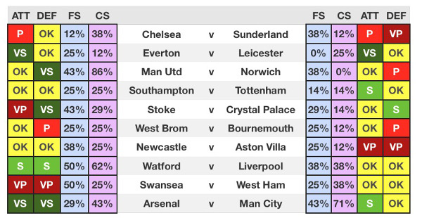 The best and worst performing teams in each column of data are coloured green to red. These three tables look in detail at attack, defence and finally how they match up in the Gameweek ahead. In the Fixtures table the failed to score (FS) and clean sheet (CS) data on the left is the home teams’ home stats for the season, whilst the data on the right is the away teams’ away stats for the season.
