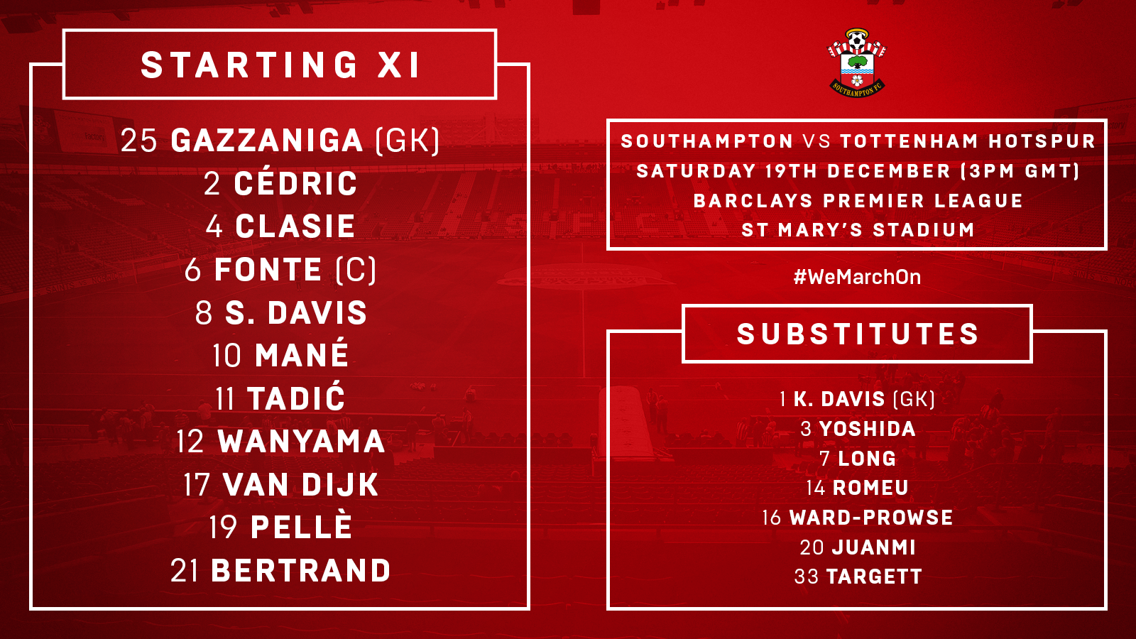 Gazzaniga, Cedric Soares, Fonte, van Dijk, Bertrand, Wanyama, Clasie, Mane, Steven Davis, Tadic, Pelle.