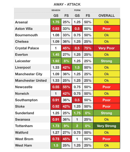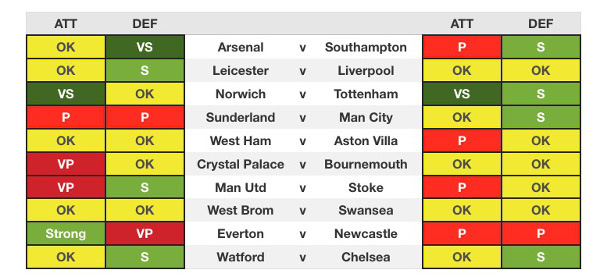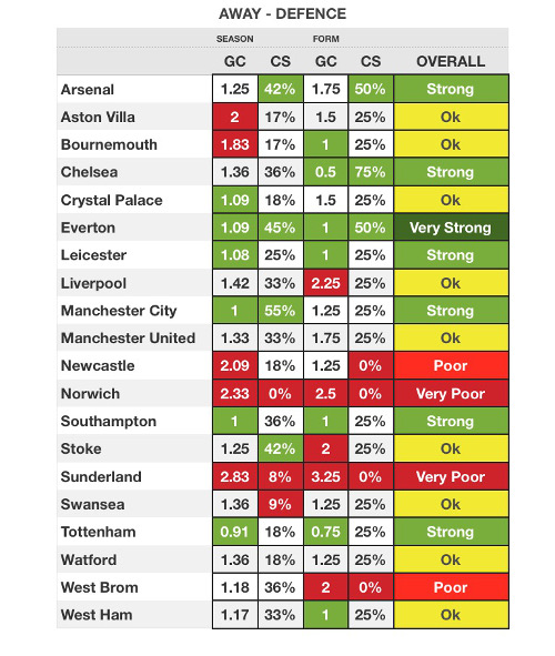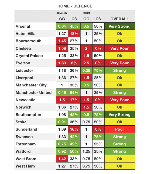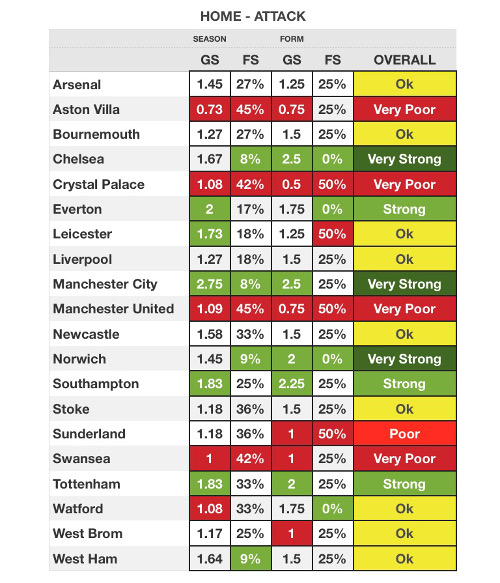The best and worst performing teams in each column of data are coloured green to red. These five tables look in detail at home attack and defence, away attack and defence and finally how they match up in the Gameweek ahead. In the Fixtures table, the ratings on the left are based solely on that team’s home stats and the ratings on the right are based solely on that team’s away stats.