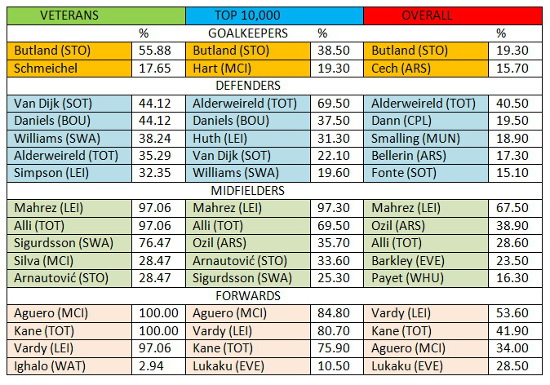 Gameweek 30 was reduced to only five games due to the FA Cup Quarter-Finals and as we expected the veterans took advantage. While many managers overall and in the top 10,000 struggled to field eleven players, our veterans were well prepared, with the majority only needing one transfer to ensure they had a full compliment. This bunch of Fantasy management stalwarts, who are made up of previous winners, FFScout moderators and contributors and those riding high in the Hall of Fame, also continued their investment in Sergio Aguero and Harry Kane. After Gameweek 30 both have 100% ownership among the veterans.