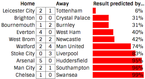 Tottenham feature once again at the top of the unpredictable results chart, with their defeat at Leicester predicted by just 6% of people. Wins for Liverpool, Arsenal, Man City and Chelsea were easy to predict, but their starting lineups were not, much to the frustration of Fantasy managers everywhere, including this one.