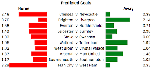 Overall, the crowd is expecting fewer goals this weekend, with Manchester City bringing up the average significantly, and I had a quick look back at previous goal predictions for City.