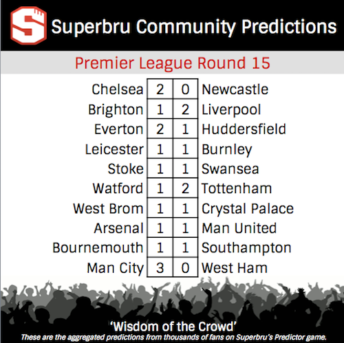 Each week we review the aggregated predictions on Superbru’s Premier League Predictor game, using the collective Wisdom of the Crowd predictions to guide our fantasy football thinking.