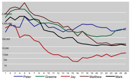 The graph below shows the ranks of the Top Five managers over the 26 gameweeks so far. The vertical scale is from rank 1 to 3m. The distance between the ranks corresponds to the number of points separating them. For instance there are 252pts between rank 1 and rank 100k but only 118pts between 100k and 1m. The graph gives an idea of how difficult it is to move up the ranks as you near the summit