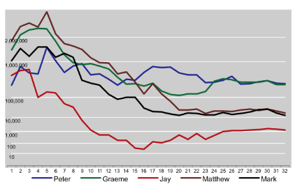 The graph below shows the ranks of the top five managers over the season so far. The vertical scale is from rank one to 3m. The distance between the ranks corresponds to the number of points separating them. For instance there are 286pts between rank one and rank 100k but only 151pts between 100k and 1m. The graph gives an idea of how difficult it is to move up the ranks as you near the summit.