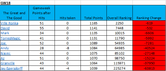 The Christmas no.1 was Ville Ronka despite suffering two red arrows. In fact, over the two game weeks there was only 4 green arrows across the whole group which shows what challenging time it has been for all FPL managers. All The Great and The Good have lost ground on their GW17 position.