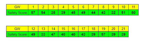 In order to qualify, you need to at least match the safety score after hits for each of the first 21 Gameweeks. These can be found below.