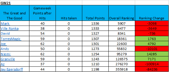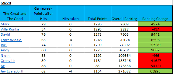 Just as the Premier League title race is hotting up so is the fight for the crown of the greatest of The Great and The Good. We have a new leader for the first time since GW6 as Mark now sits at top of the tree. David plays the role of Spurs in 3rd place and is less than 2,000 places away from the early season favourite Ville Ronka.