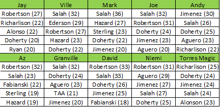 Two of the managers played the triple captain chip this week with Granville and Joe taking the lucky dip, sadly this did not pay off as they went for blanking City men Sterling and Aguero.