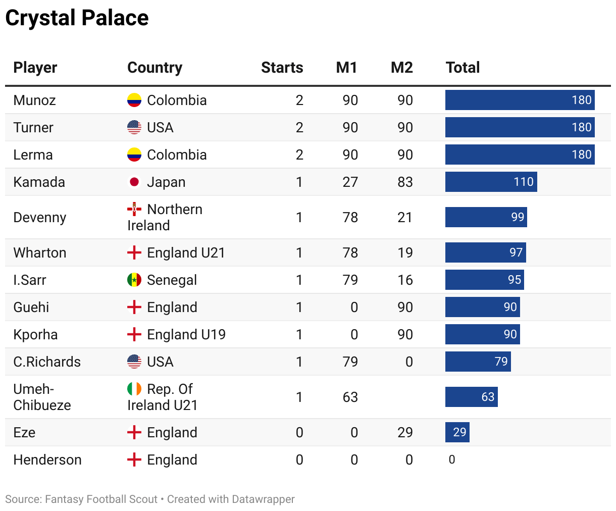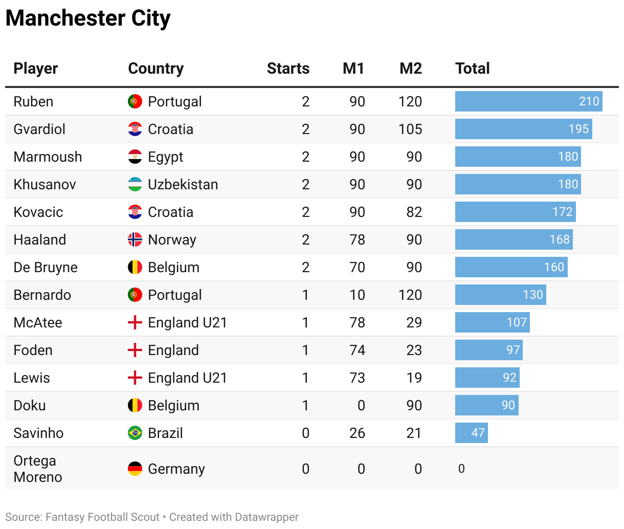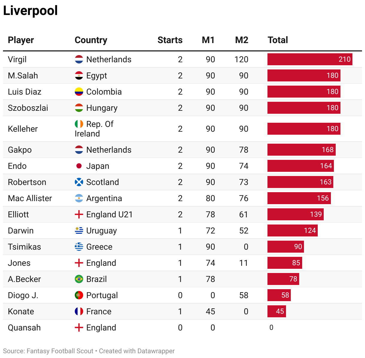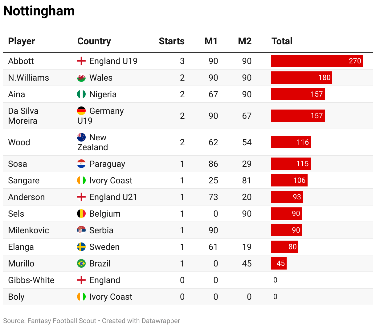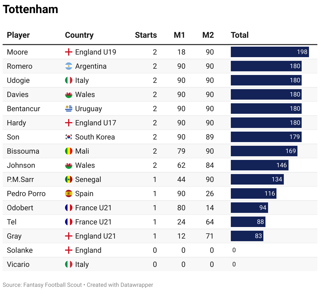 Please note that any gaps in the M2 column should be because a player didn’t appear in the matchday squad in one of their countries’ two internationals (not necessarily the second game).