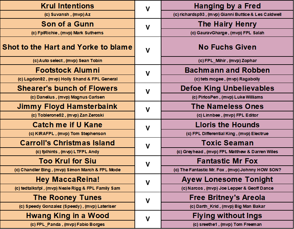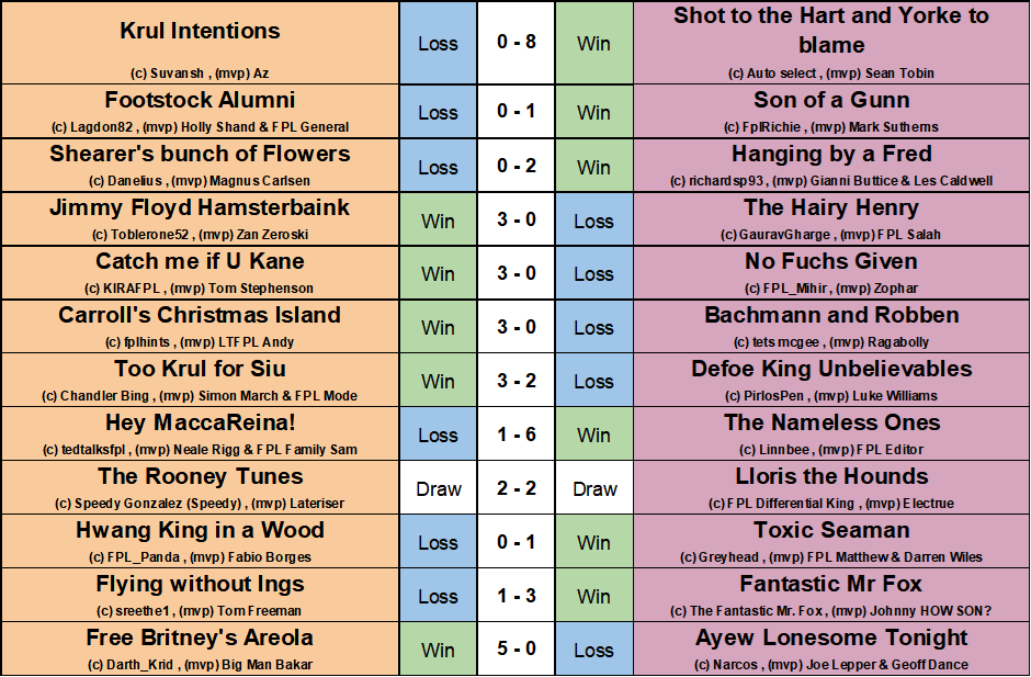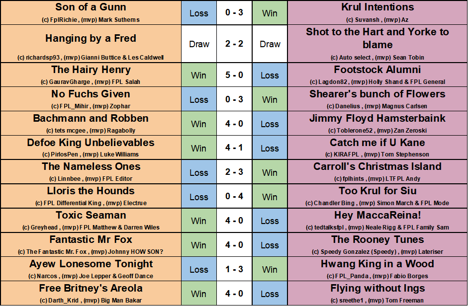 The Henry’s won 5-0 against the Alumni with FPL Salah on the scoresheet, Defoe King Unbelievables had a 4-1 victory with captain PirlosPen doing a Roy of the Rovers scoring a hat-trick and Too Krul for Siu scored four as well despite FPL Differential King giving a fine goalkeeping display on 90 points.