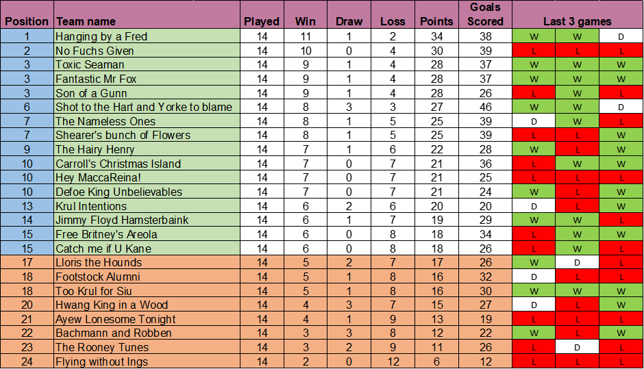 The seemingly invincible No Fuchs Given have taken a step back and we have new leaders in the H2H with Hanging by a Fred now the number ones, my lot of Toxic Seaman are loitering with intent in joint 3rd with Fantastic Mr Fox and Son of Gunn.