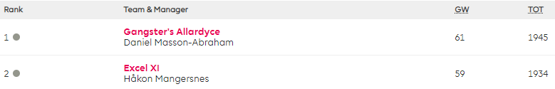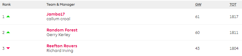 Daniel Gustafsson is the new leader of my January to May League (league code fy0acw) and has risen from 18k after Gameweek 20 to 961st now. He has had two previous top 10k finishes and is 546th in our FFS Live Hall of Fame.