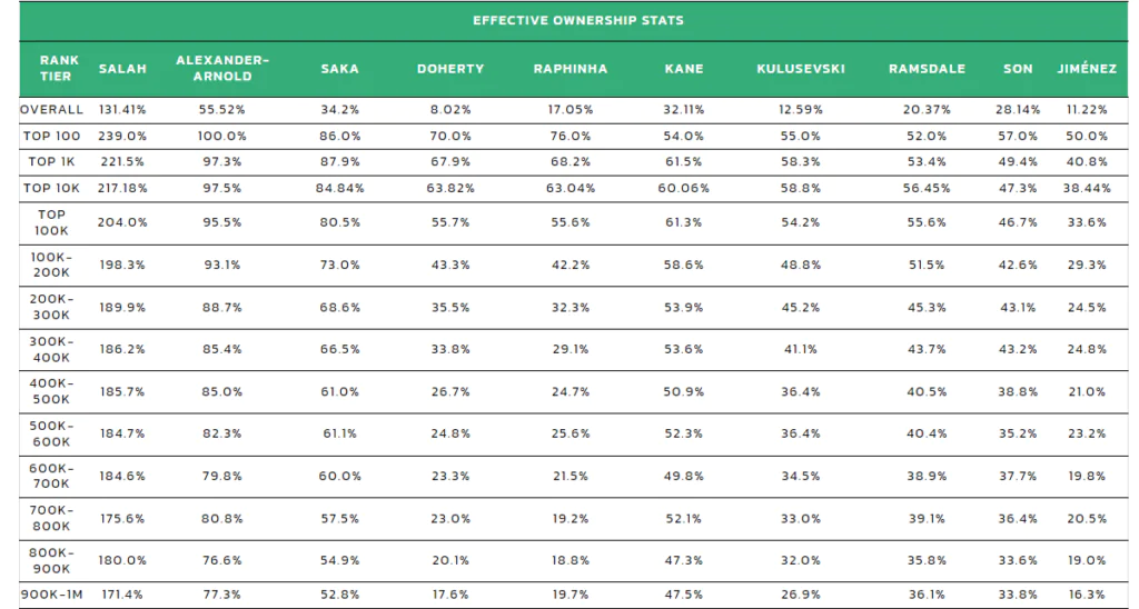 In laymen’s terms, if you didn’t Triple Captain the leading points scorer in FPL and you’re in one of the rank tiers below where Salah’s EO is in excess of 200%, you’ll lose a bit of ground if/when he returns.
