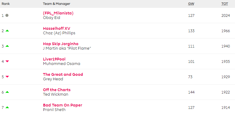 Obay Eid (FPL_Milanista) tops the FFS Family mini-league for a 25th week after playing his Bench Boost, and has risen to 55th overall.