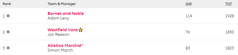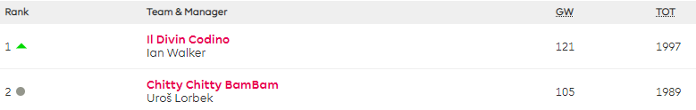 Ian Walker is the new leader in my Top 10k Any Season mini-league (league code kgmryk) after playing his Wildcard and captaining James, and is now 221st overall. His best previous finish was 7,283rd in 2014/15.