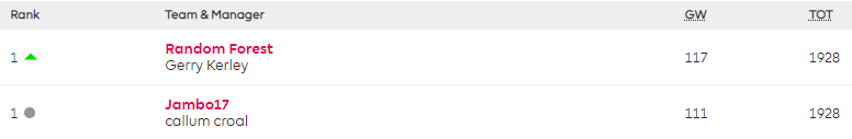 Gerry Kerley and Callum Croal are now joint leaders in Skooldaze’s FPL Vets 2006 or before mini-league (league code hz9bz2) and have risen to 5,238th overall after both of them played their Wildcards and captained James. Gerry had previously led from Gameweek 11 to Gameweek 18 and again after Gameweeks 20 and 24, while Callum had previously led after Gameweeks 22, 23 and 27.