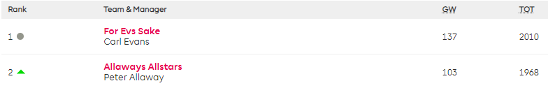 Carl Evans tops my Multiple Top 10k Finishes mini-league (league code 03t1fd), which is for teams with two or more top 10,000 finishes, for a sixth week after playing his Bench Boost and captaining James, and has risen to 107th overall.