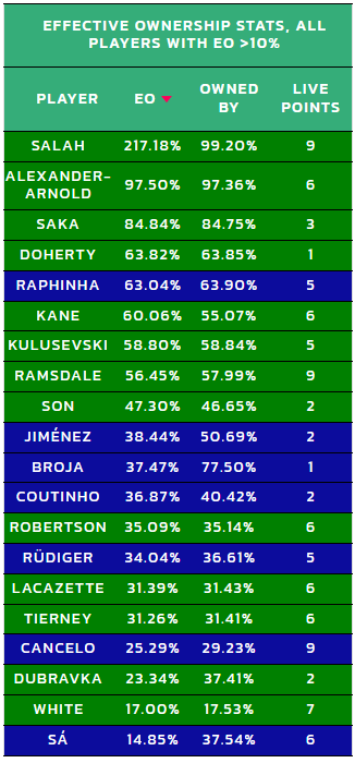 Above: FPL assets sorted by ‘effective ownership’ in the top 10k. All bar Martin Dubravka of the players in green above are in action this evening.