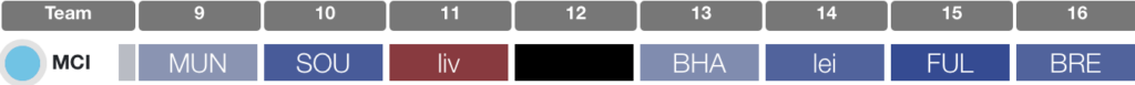 Now, Man City play at home in each of their next two matches, hosting Manchester United and Southampton. They do, however, have a Blank Gameweek 12, following the announcement that the match with Arsenal has to make way for the Gunners’ Europa League clash against PSV Eindhoven.