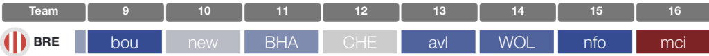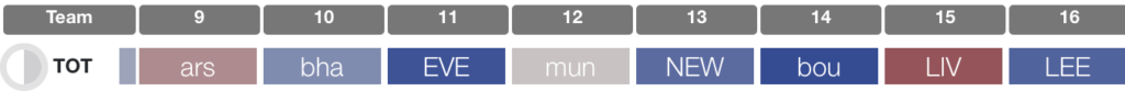 Leicester City sit third on our Season Ticker for fixture difficulty between Gameweeks 9-16, with newly-promoted Nottingham Forest and Bournemouth up next, but it’s hard to say which forwards starts. Jamie Vardy (£9.2m) was benched again in Gameweek 8, with Brendan Rodgers acknowledging that age was now a factor with the 35-year-old striker, but could return to face Forest, with his character and leadership qualities possibly needed. Patson Daka (£5.7m) and Kelechi Iheanacho (£6.2m) are the alternatives, although the former is currently flagged.