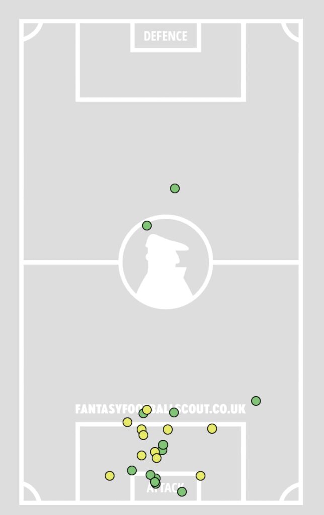 In that time, he has scored six goals, despite a tough run of fixtures which has included games against Liverpool, Spurs, Arsenal and Brighton, while no player can top his totals of 31 goal attempts or 25 shots in the box.