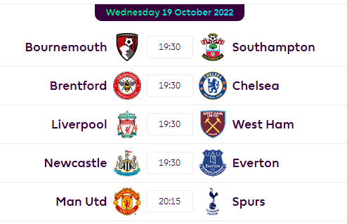 Five more Gameweek 12 matches take place on Wednesday evening, with Manchester United v Tottenham Hotspur following on from four 7.30pm BST kick-offs.