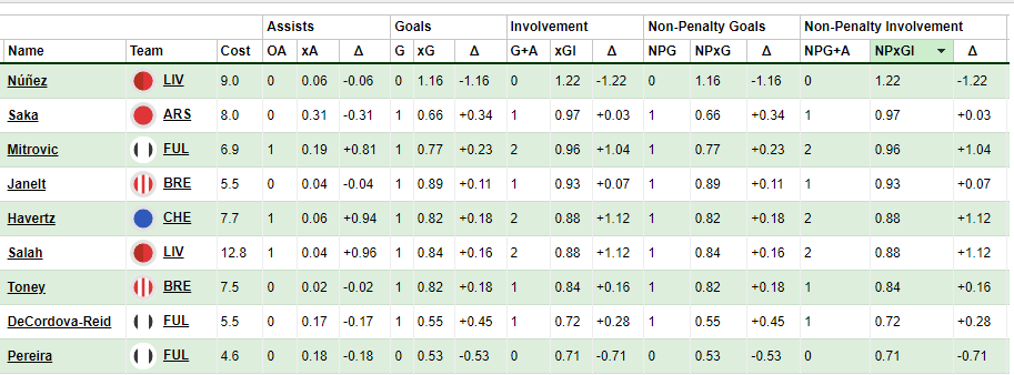 Above: FPL assets sorted by non-penalty expected goal involvement (NPxGI) in Gameweek 16 so far