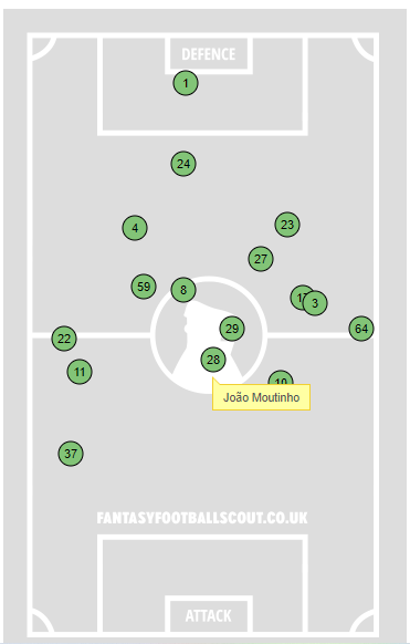 On the tactics front, it was interesting to see Joao Moutinho (£4.7m) deployed as the most attacking central midfielder, with his average position even higher than that of Costa.