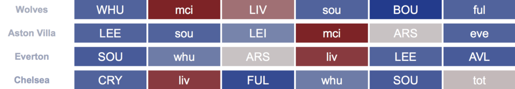 Aston Villa’s next three matches look fine on paper, but top two Man City and Arsenal follow, while Everton’s fixtures are a decidedly mixed bag. They will also have to navigate the next three weeks without key midfielder Alex Iwobi (£5.4m), who picked up an injury at Old Trafford in the FA Cup.