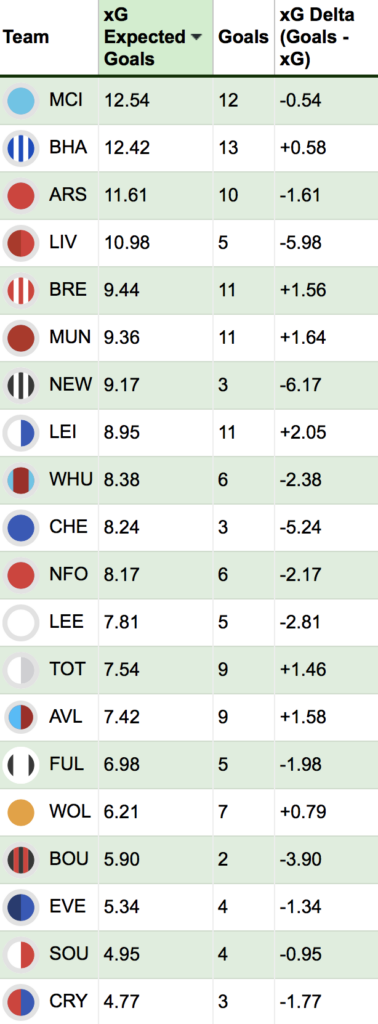 Manchester City and Brighton and Hove Albion are the league’s two most potent attacks right now, leading the field for xG and actual goals scored. Both sides have created an abundance of chances in their last six matches, averaging over 2.00 xG per game, which is hugely impressive.