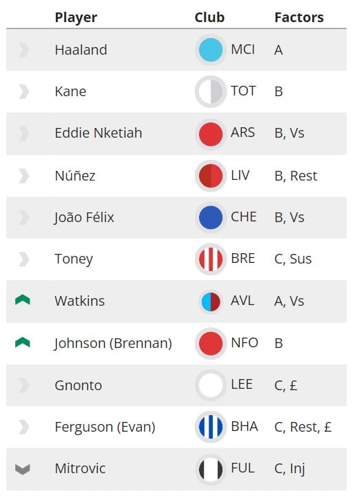 The top 13 midfielders remain in the same order as before, even though Marcus Rashford (£7.3m), Bruno Fernandes (£9.8m), Kaoru Mitoma (£5.4m) and Solly March (£5.1m) won’t participate at the weekend.