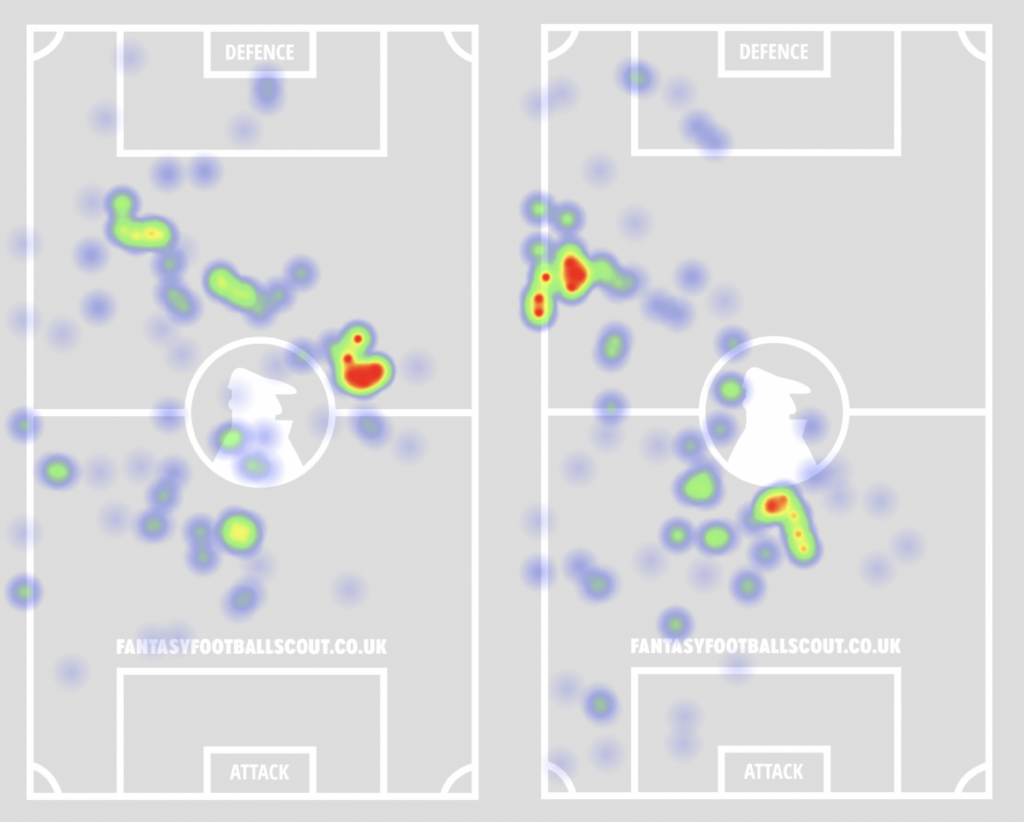 When Stones’ touch heatmaps from Gameweeks 29 (left) and 27 (right) are compared, we can see is allowed to venture quite far forward, with a lot of his touches coming in the opposition half.