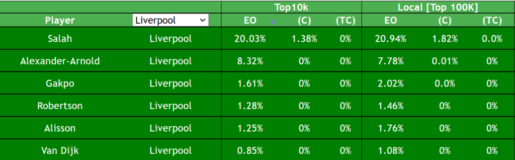 Above: Effective ownership numbers in the top 10k/100k, via LiveFPL