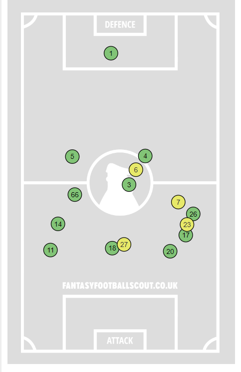 Above: Liverpool players’ average positions in Gameweek 32, including Trent Alexander-Arnold (66) and Andrew Robertson (26)