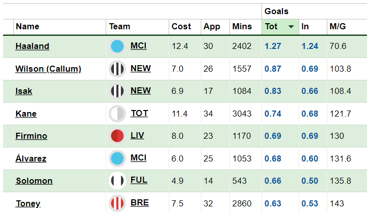Furthermore, over the whole season, Wilson and Isak rank second and third for points per 90, goals per 90 and minutes per goal, beaten by Erling Haaland (£12.4m) each time.
