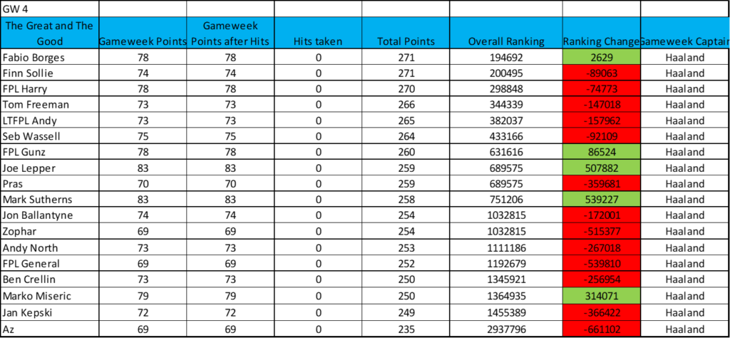 The battle for supremacy in The Great and The Good just got interesting, as Fabio Borges, Hall of Fame no. 2, is now level on points with Hall of Fame no. 1 Finn Sollie. He just edges top spot as he has taken one less transfer.