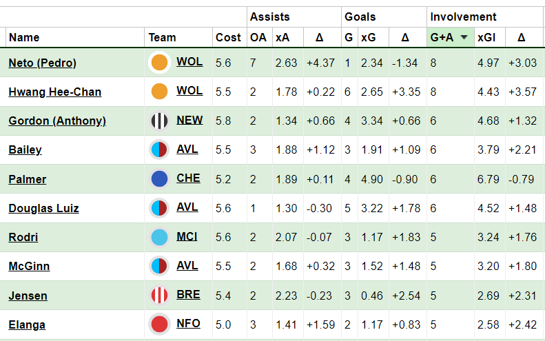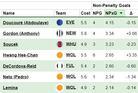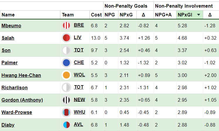 Above: FPL midfielders sorted by non-penalty expected goal involvement (NPxGI) over their last six matches