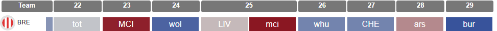 A tough run of games now awaits Brentford but, as mentioned in our Ones to Watch article earlier this month, Toney scored five goals and assisted another against his Gameweeks 22-28 opponents last season (10 games played).